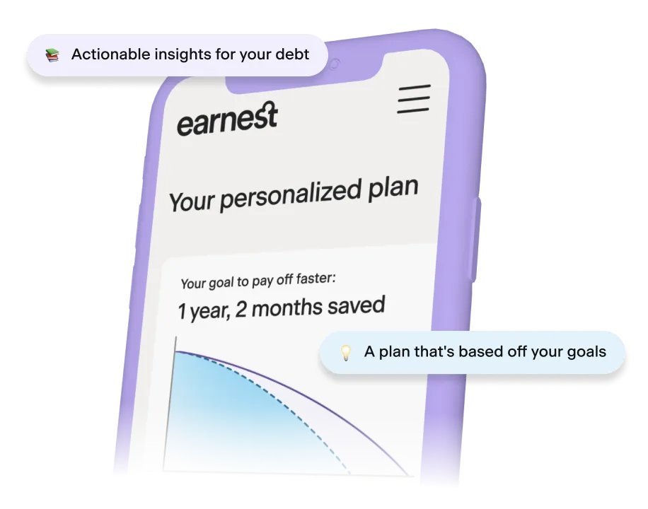 Disclaimer: Earnest is not a licensed credit repair organization, debt management company, debt settlement company, credit counselor, nor any other organization in the business of offering advice as to how to improve or repair your credit. Any information provided on this website that pertains to your credit is not to be construed as credit improvement or credit repair advice from Earnest.